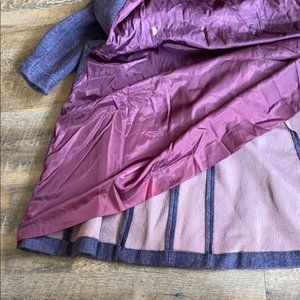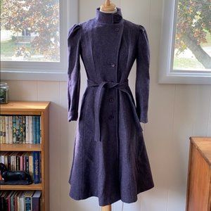 Vintage 1970's does Edwardian/Victorian puff sleeve fit and flare coat. Tie belt buttons onto the back of the coat. No fabric content tag, but feels like a wool blend. Only tags are a union tag, dry clean only tag, and an old size 9 tag. Lined in taffeta. Some discoloration/fade noted on the lining. No other issues. Measurements taken on the outside of the coat, laid flat, are: shoulder 14.5”, bust 17.5”, waist 15“, length 42.5", and sleeve 22". Would never part with this if it were my size!