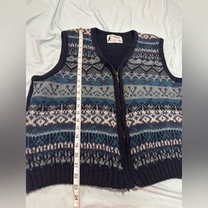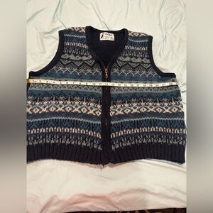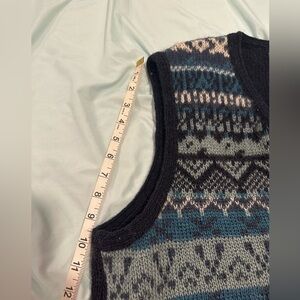 VTG 70’s/80’s Floss Women’s Wool Vest. Full Zip. Geometric Blue Fair Isle Pattern. Normal wear. Great condition for the age. No rips stains or defects. Please see pictures for measurements.