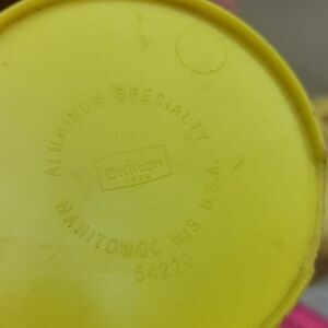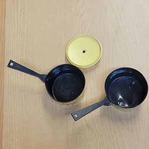 A cute vintage kitchenware playset. This comes with 2 plastic teapots without lids. 2 tin pots..1 with a lid and one pan. We have also included 3 plastic cups to add to the fun. There are some dents and wear on them. But they are still fun to play with. They are from Aluminum Specialty out of Manitowoc WI. USA.