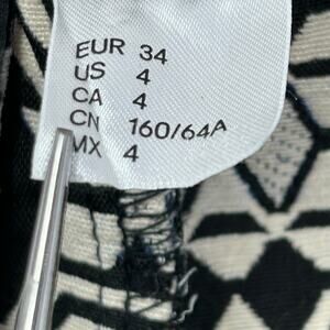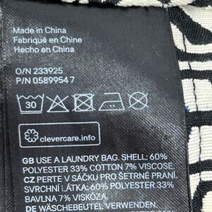 In good condition except has two areas of barely visible stains on front of skirt. Could be just the fabric irregularities. Cream background with black and blue design. Side zip closure. Fabric is polyester cotton blend. Made in China