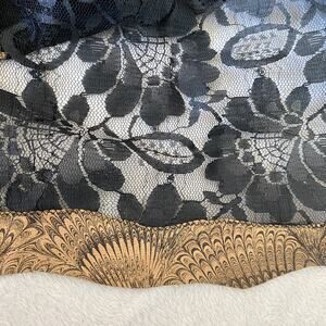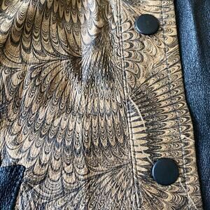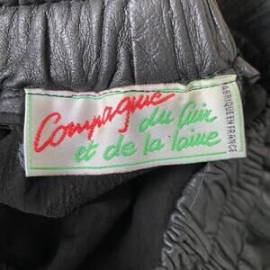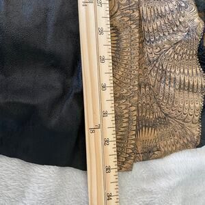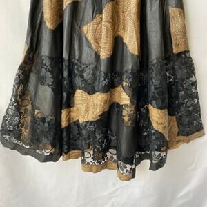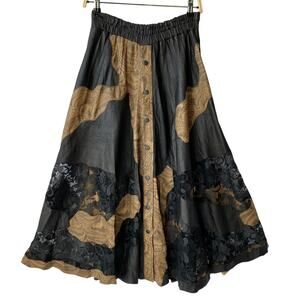Rare find Vintage 1980s Compagnie from France Patchwork Midi Skirt with black textured leather, brown feather print leather and floral lace.