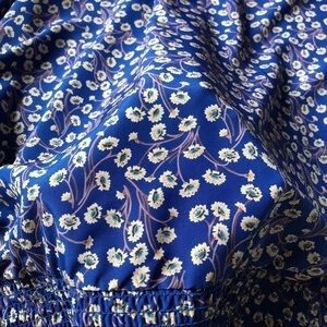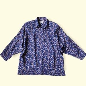 Vintage 80s USA made Adelaar Matson cobalt blue Ditsy floral blouse popover shirt. Half sleeves with dropped shoulders. Smocked hem, not very stretchy. Shirt collar with half button front panel. The size label washed off, very large, please see measurements. Great condition.
