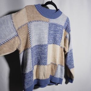 VTG 80s 90s Blue Tan Patchwork Knit Sweater Mens L Jantzen Quirky Grandpa Quirky vintage retro boho bohemian grandma gma core gpa core When Harry Met Sally Harry Burns coogi style high neck crew neck breathable long sleeve funky
