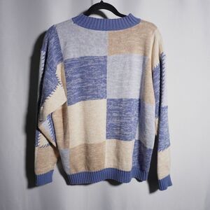 VTG 80s 90s Blue Tan Patchwork Knit Sweater Mens L Jantzen Quirky Grandpa Quirky