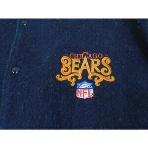 The product is a vintage 80s/90s Chicago Bears 1932 World Champions wool bomber varsity jacket in size XXL. This mid-length jacket is made of wool with a solid blue color and features the team's logo as accents. Perfect for casual wear, this jacket is a stylish addition for men who appreciate retro football fashion. The DeLONG brand adds a touch of authenticity to this classic piece that is ideal for the winter, fall, and spring seasons.