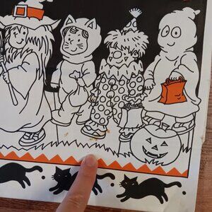 Get your markers and crayons ready! Up for sale is a unique Vintage "Color Me" Happy Halloween Trick-or-Treat or Gift Bag from American Greetings. I think this was made either in the 80s or the 90s. This rare bag features an awesome black-and-white illustration of children in Halloween costumes (witch, cat, clown, and ghost). The bag is meant to be colored on so a little one can make their own Halloween bag. The bag is in new, unused condition with the original "COLOR ME!!" tag attached. The black cord handles are intact. Note that there are a few very small brown spots near the bottom edge of the main illustration (see close-up photo). Despite the flaw, this is a really cool Halloween find that I hope will find a new owner who will enjoy it.Thanks for looking!