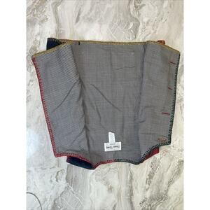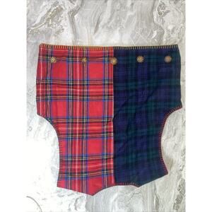 This vintage Sharon Young vest is a festive addition to any wardrobe. The plaid tartan pattern and houndstooth design give it a classic Christmas look. The vest is made of cotton and should be hand washed only. It features a button closure and a patchwork design with buttons for added detail.