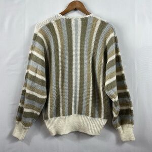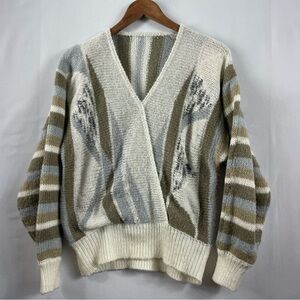VTG 80s Abstract Knit Glam Sweater Neutral V-Neck Pads Metallic Disco New Wave