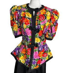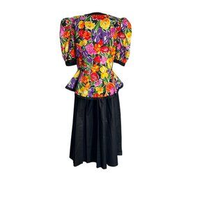 VTG 80s Antara Floral Puff Sleeve Peplum Dress Black Skirt Bow Trim Bold 13/14 Cotton Shoulder Pads 2 Piece in good preowned condition. This is a vintage garment so please check measurements. Top measures across back under arms 20.5" and from shoulder to hem 25.5". Skirt measures across waist 13.5" and 33" waist to hem.