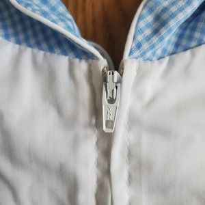 This is a vintage baby romper with a cute little train theme. The romper has a blue plaid and white colorblock fabric and a embroidered applique design of a train on the chest. It is collared and has a zipper down the back for easy changing. The condition is great. The applique part has some slight yellowing due to the adhesive used under it by the manufacture.