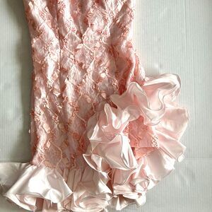 Details: Asymetrical cocktail or semi formal dress in pale pink. Dress has a pattern of lace, sequins and ribbon, bottom has a short ruffle the rises on the left. Dress is strapless but comes with a matching shrug or bolero.