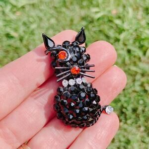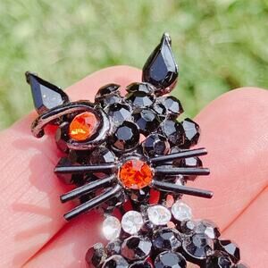 VTG 80s Brooch Halloween Black Cat Orange Eye Rhinestone Enamel Creepy Cute Pin