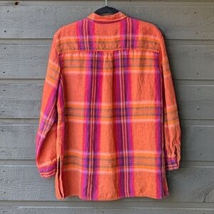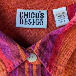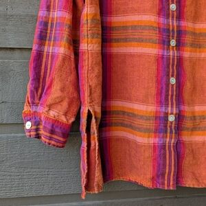 Vintage 1980s vibrant plaid 100% linen button front tunic shirt from Chico's Design. Excellent preowned condition with no flaws. Long sleeves. Orange, red and purple windowpane plaid with real mother of pearl buttons. Side slits. Long line tunic length. Made in Hong Kong. True vintage. Machine washable. Clean. No flaws.