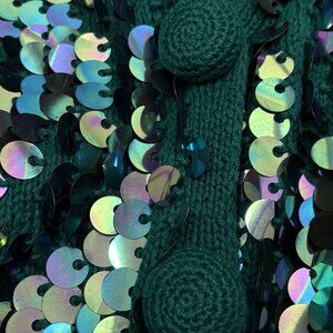 Absolutely gorgeous and festive, vintage, 1980s, Carole Little emerald green iridescent sequined knit cardigan sweater. Made from a ramie cotton knit material and features oversized, three, knit buttons and a V-neck design. Has shoulder pads. There are concealed black buttons for closure. The oversized knit buttons conceal them.