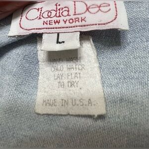 This vintage 80s denim top by Clodia Dee is a stunning addition to any wardrobe. Featuring stylish studs and shoulder pads, this shirt is perfect for any occasion. The size L top is made from high-quality denim material, ensuring durability and long-lasting wear. The blue color is perfect for any season, and the regular size is sure to fit most women. Made in the United States, this top is a must-have for any vintage clothing enthusiast.