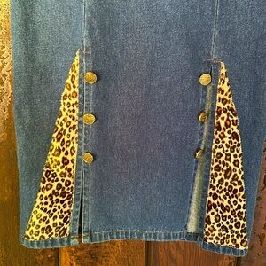 Vintage 80s long straight denim jean skirt with double front slits, gold accent buttons and velvety-furry leopard print accents. Back metal zipper and back elastic waist panel.