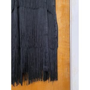Great Gatsby style midi in tiered black fringe on textured satin. Back zip, unlined.