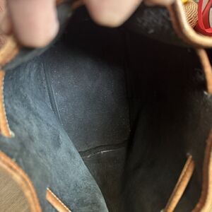 Condition: Good vintage condition with natural patina and wear on trim and strap from use. Leather is thick, supple, and well-kept. Interior is clean raw suede. Please zoom and review photos to see exact details.
