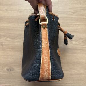 Genuine vintage Dooney & Bourke All Weather Leather drawstring bucket shoulder bag in black pebble leather with tan trim. Made in USA. Adjustable strap, brass duck logo medallion, and leather tassels. Classic early Dooney craftsmanship.