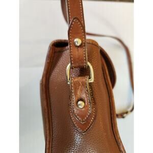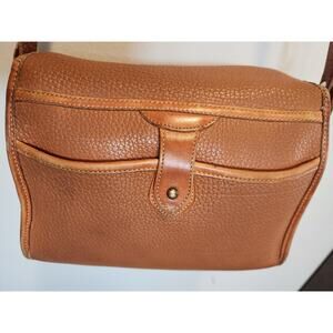This is a vintage (likely from the late 80's) Dooney & Bourke, AWL ~ All Weather Leather~ (in D & B's Classic color Saddle Tan) Essex Shoulder Bag. Solid Brass hardware was just freshly polished and bag has just has been leather conditioned. Beautiful Patina on trim. This has the red, white & blue USA cloth tag/label/registration/serial number fully intact and legible (45 586557).