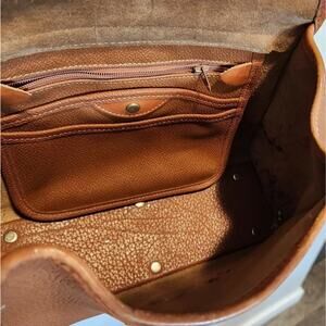 Interior suede lining has pen marks (please see all photos and zoom in as they are part of my description). Exterior wall has a pocket, as well as a zippered, interior wall pocket with 2 compartments. Solid Brass feet to protect bottom. Leather edges/piping has some wear some heavier rubbing in a couple of those spots (please see photos). This is a beautiful, pre-owned Vintage Dooney and Bourke bag with expected and normal wear. Approximate measurements: 11" w x 9.5" h x 5" deep. 1 lb and 5.8 oz.