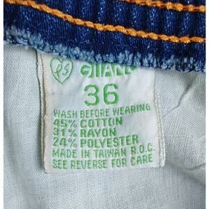 Authentic vintage Gitano jeans from the late 1980's. Made in Taiwan R.O.C., featuring a high waist, tapered leg, bold orange contrast stitching and elastic waist. Soft medium- weight denim blend (45% cotton, 31% rayon, 24% polyester) with that classic structured fit Gitano was known for. Brass heart logo button, leather back patch and five-pocket styling. Minimal wear and vibrant color. It looks like these might have been professionally hemmed. These also have a couple of picks on the bottom right leg. Please see photos for details and measurements. These appear to have been professionally hemmed - review photos and measurements carefully.