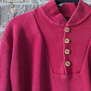 Vintage 1980s red 100% cotton ribbed knit henley sweater from Eddie Bauer. Long sleeves. 4 button placket. Wooden buttons. Light wash wear and fading from age. No flaws.