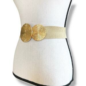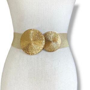 VTG 80s Elastic Stretch Belt Double Medallion Buckle Sz S/M Gold Metallic Y2k