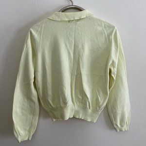 vintage 80s citrus yellow-green cardigan with polo collar. the color is best shown in the first photo. has somewhat of a cropped length. tagged a size large, model is 5'9" and a size 10. in good condition, some light discoloration on the right side, shown in last photo.