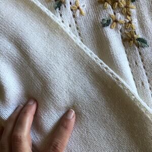 π Gorgeous hand-embroidered floral knit in soft cream with red, yellow, and green blooms, crochet trim, and pearl button closure at back. Ramie / Cotton Blend