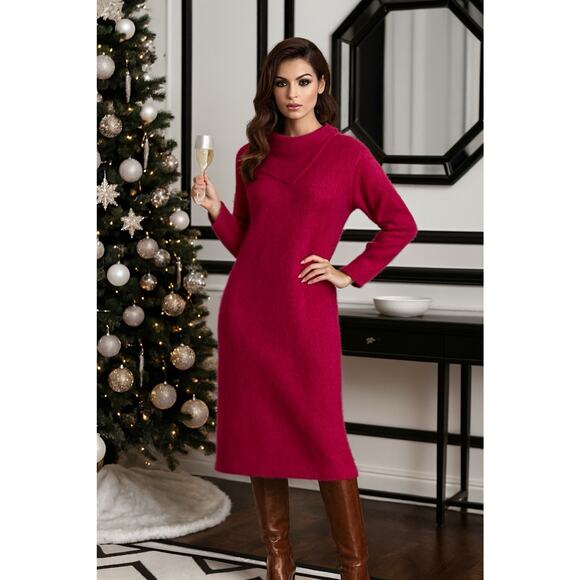 VTG 80s Fuchsia Lambswool Angora Sweater Dress - M, Holiday Soap Opera Glam, NWT