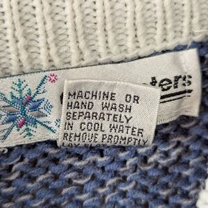 Vintage 1980s mock neck snowflake ugly Christmas holiday sweater from Gina Peters. Made in Korea. Long sleeves. Heathered blue and white intarsia knit snowflake geometric design. 100% acrylic. Machine washable. Clean. 80s true vintage. No flaws.