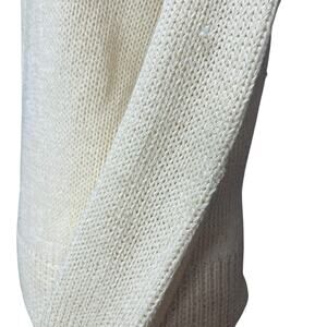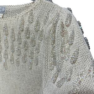 This VTG ivory NANNELL hand-knit sweater is a stunning 1980s statement piece featuring intricate beadwork. The bodice is accented with loops of elongated iridescent beads that create a dripping fringe effect, while the shoulders and upper sleeves are heavily embellished with clustered beads for added dimension. Beads continue throughout the entire sweater in subtle accents. . The puff sleeves and embellished boat neckline highlight the bold and glamorous design of the era. The sweater is heavy, extremely soft, and hand-knitted, offering unique craftsmanship and a timeless retro charm.