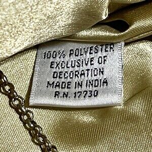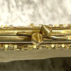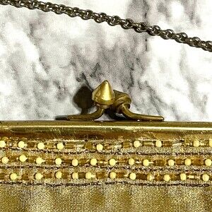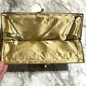 Hidden optional chain handle, hides inside when not in use. The inside is gold satin and is clean and appears unused. Minor tarnishing on the metal frame. Good vintage condition.