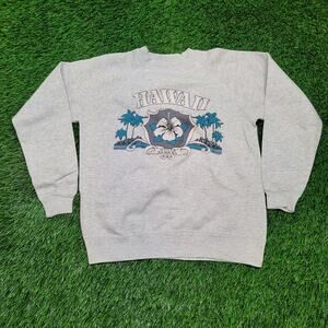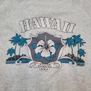 Capture vintage island vibes with this 1980s Hawaii sweatshirt. Features soft gray cotton, raglan sleeves, and a distressed tropical graphic with hibiscus and palm trees. Classic surf-inspired design with retro Hans tag—perfect for collectors or laid-back streetwear looks.