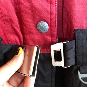 π Retro colorblock snowsuit with metal belt buckle, zip cuffs, and elastic waist for classic alpine style. Fully lined with functional zip pockets and high collar.