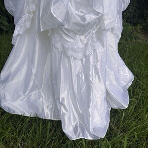 This stunning vintage Jessica McClintock satin wedding gown is truly to die for! With its romantic off-the-shoulder styling, delicate lace, ruffled details, and feminine silhouette, this dress is perfect for a bride looking for a timeless, girly, and unique look.