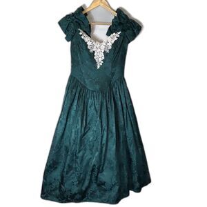 VTG 80s Jessica McClintock Green Brocade Lace Neck Formal Midi Dress Size 13/14