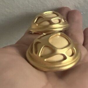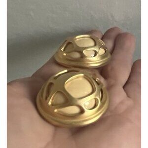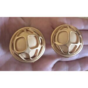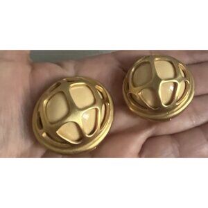 In excellent preowned condition, I never wore them. VO signed which is associated with Les Bernard. Quality beautiful clip-on earrings with matte satin abstract gold cage and an ivoryish/yellowish Lucite cabochon inside. 1-1/2", classic pair of earrings by a great designer of jewelry.