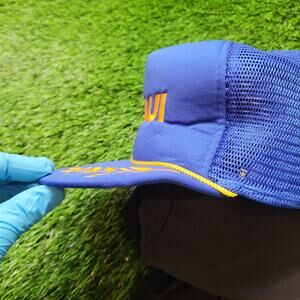Vintage 80s Maui Hawaiian Headwear rope trucker hat navy blue gold embroidery snapback mesh cap island souvenir