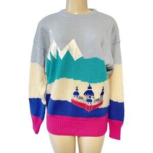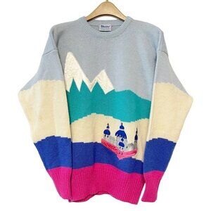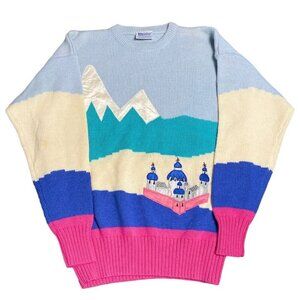 VTG 80s Meister Wool Grandpa Sweater Pink Blue White Colorblock Ski Retro Castle