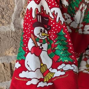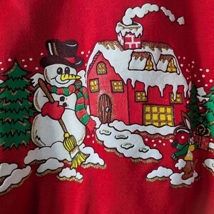 Vintage 1980s Christmas Holiday crew neck sweatshirt from Nutcracker. Bright red sweatshirt with snow topped holiday scenes with a festive moose, hardworking snowmen, evergreen trees, a cat with ear warmers holding a present, a rustic cabin with smoke coming out of the chimney. Sparkly glitter accents. Not so ugly Christmas sweatshirt. Made in USA. Loose fit. Eighties true vintage. 100% acrylic. Wash wear. Clean.