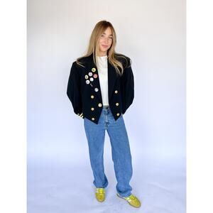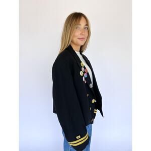 Make a statement that marches to its own beat with this Vintage 1980s oversized cropped military jacket, the perfect fusion of bold retro streetwear and structured rebellion. This blazer features sharp tailoring, iconic gold crest buttons, and gold sleeve trim — echoing classic naval uniforms with a punk twist.