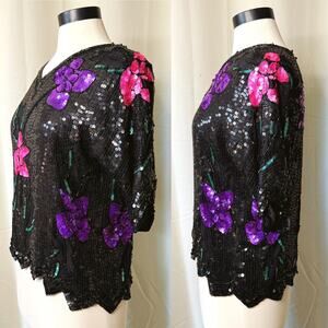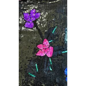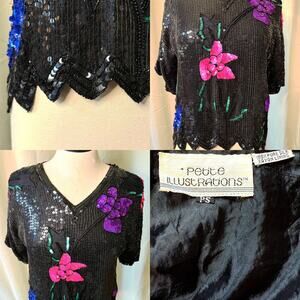 ⭐️ Vintage 80s Petite Illustrations silk top with black sequin base and bold floral accents in hot pink, purple, blue, and green. Features scalloped hem, short sleeves, and shimmering texture. Perfect for parties, festivals, or holiday nights when you want a colorful statement piece.