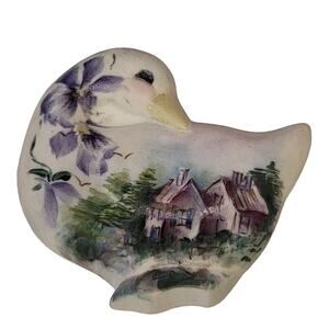 VTG 80s Porcelain Goose Ornament Hand Painted Houses Flowers Trees Hobby Piece