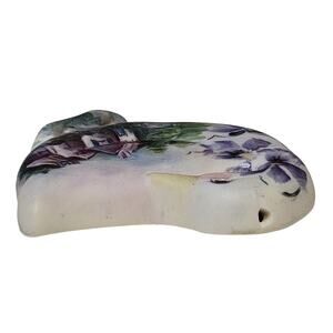 White porcelain goose that is hand painted with houses, trees and purple flowers. There is a small hole on top of the head for hanging. Signed on the back "Hand Painted by Ramona Nale 1989".