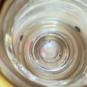 Hard plastic outside, glass interior. Top unscrews off. CLEAN! Press top to release fluid as you pour.