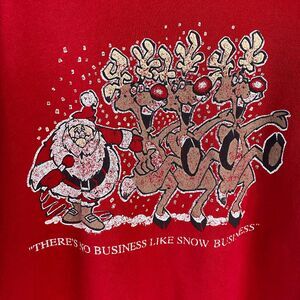 Vintage 80s red holiday sweatshirt featuring Santa and dancing reindeer with the caption “There’s No Business Like Snow Business.” Classic boxy crewneck fit with a soft interior. Graphic shows cracking and fading typical of true 80s wear. See photos.
