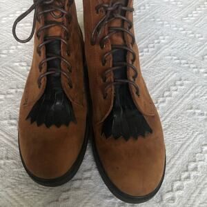 Keywords: vintage 80s boots, made in USA boots, 50 States shoes, fringe kiltie boots, suede ankle boots, brown lace-up boots, heritage leather boots, womenโs 7B, 8950
