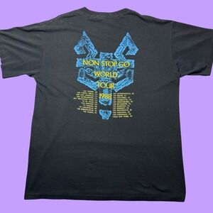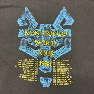 Authentic vintage concert tee from the 1988 Robert Plant "Non Stop Go" World Tour. This black t-shirt features a vibrant graphic of Robert Plant on the front, along with the tour name. The back showcases a unique wolf-like design and lists the tour dates and locations. A true piece of music history for any Robert Plant or Led Zeppelin fan.